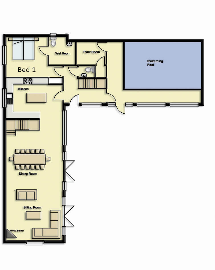 Zip and link beds (super king or twin), use of bathroom with bath and overhead shower, shared with Bedroom 5. This room is not suitable for a toddler bed or cot.