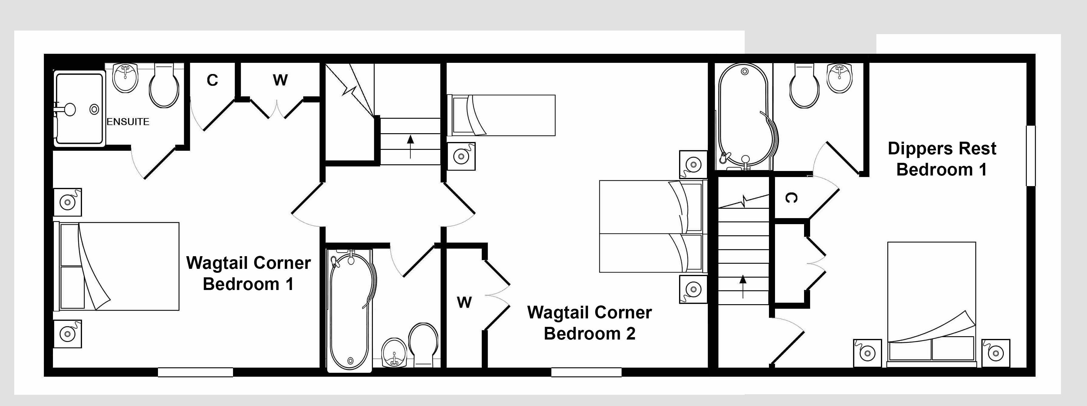 A first floor room with the choice of 3 single beds or a superking and a single. Sleeps 3. The bathroom is next door and is shared with Bedroom 1 at Wagtail Corner. Sleeps 2.